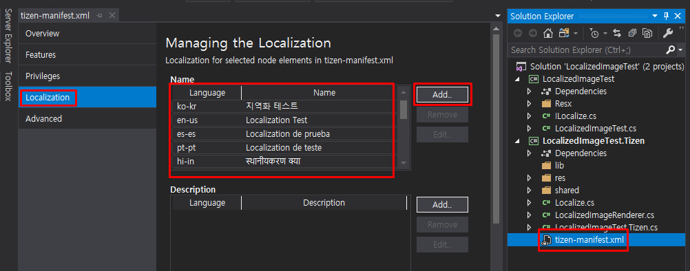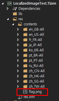 Tizen project supports localized images(resources) using different resource directories. Tizen uses res.xml file to specify the information about the directory, which contains the localized resources(For example, Image, Sound, and so on). The res.xml file is automatically generated when you build your application.